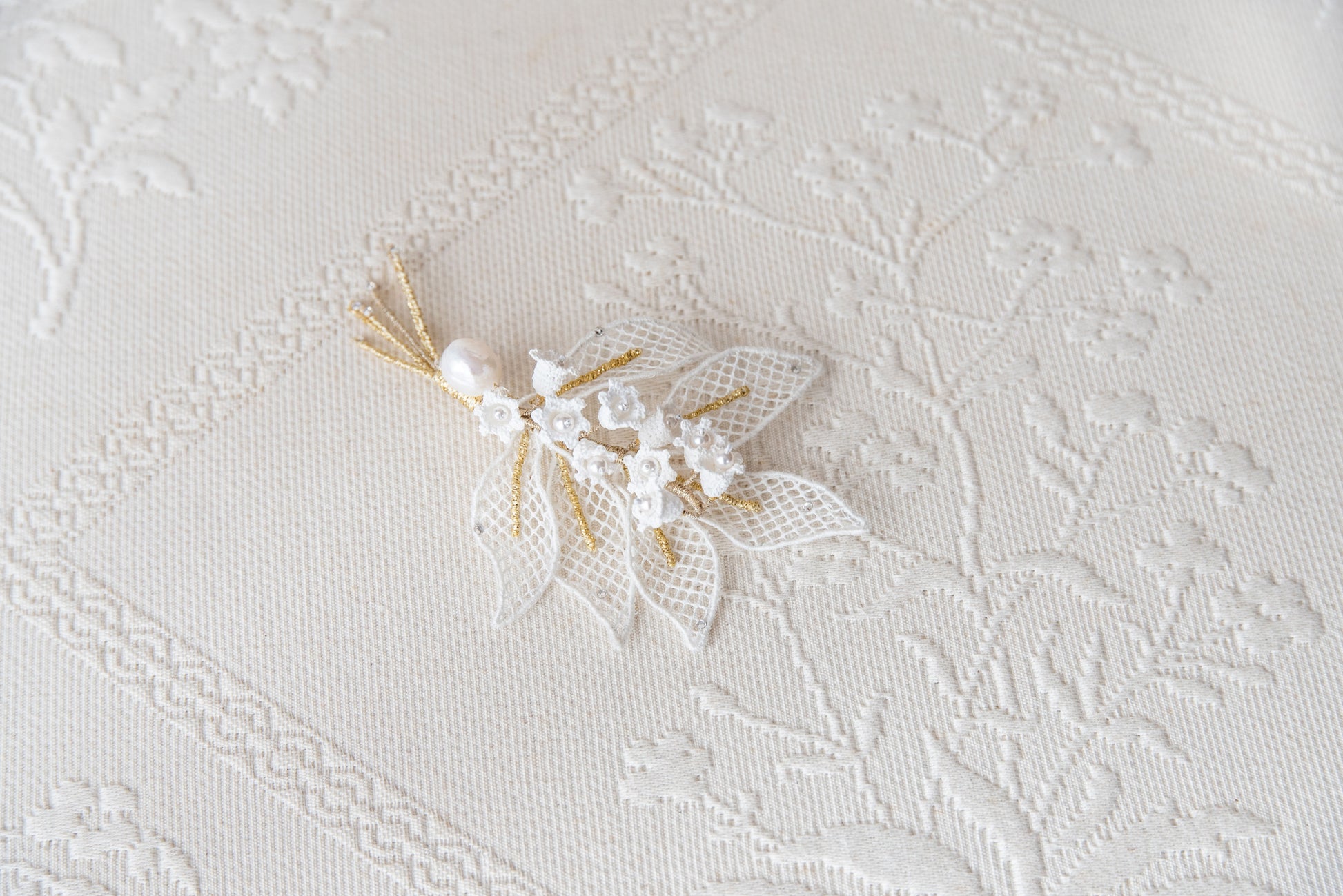 Albus - spilla per abito, ricamata a mano in Sfilato Siciliano, perle e cristalli